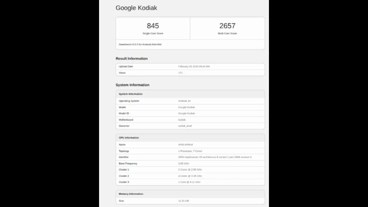 Geekbench sızıntısı, Tensor G6’nın çekirdek yapısı hakkında ipuçları veriyor. İşlemcinin sekiz çekirdekli bir yapılandırma ile gelmesi bekleniyor.