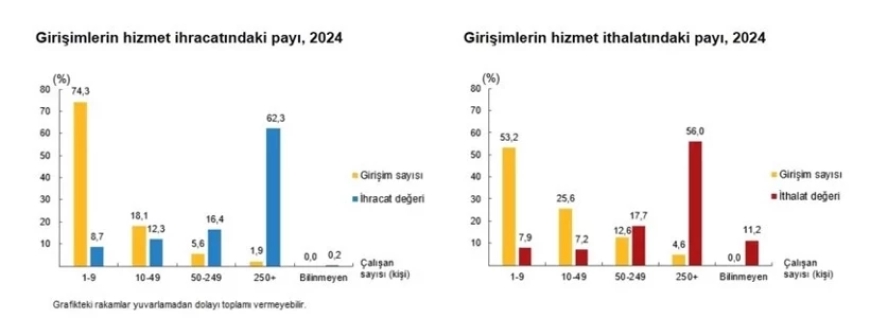 “Girişim Özelliklerine Göre Uluslararası Hizmet Ticareti İstatistikleri” raporuna göre, Türkiye’nin toplam 60,9 milyar dolarlık hizmet ihracatının yüzde 62,3’ü büyük ölçekli firmalar tarafından gerçekleştirildi. Buna karşılık, ihracat yapan girişimlerin yüzde 74,3’ü gibi ezici bir çoğunluğunu oluşturan mikro ölçekli işletmeler (1-9 çalışan), toplam ihracattan sadece yüzde 8,7 oranında pay alabildi.