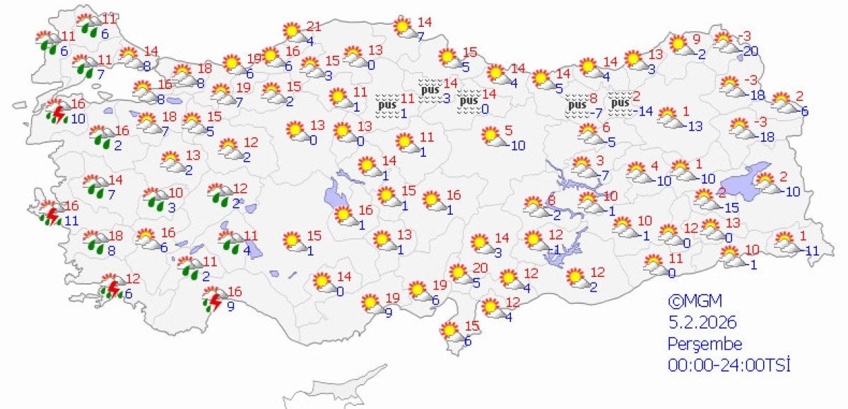 5 Şubat Perşembe: Sıcaklıklar zirve yapıyor. Batıda 18 dereceye varan bahar havası, doğuda hafif yağış ihtimali.