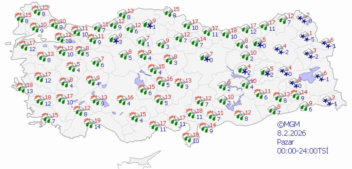 8 Şubat Pazar: Yağışlar azalıyor, doğuda karla karışık yağmur görülürken sıcaklıklar düşmeye devam ediyor.