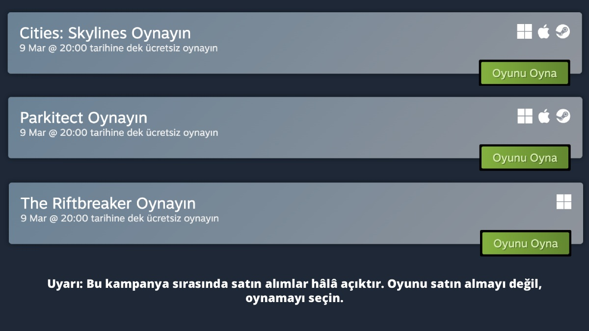 Steam platformu, oyunculara toplam değeri güncel kurla 2 bin 244 TL olan üç popüler oyunu kısa süreliğine ücretsiz deneme fırsatı sunuyor. 9 Mart 2026 saat 20.00’ye kadar geçerli olan bu kampanya kapsamında oyunları kütüphanenize ekleyip deneyebilirsiniz; ancak süre dolduğunda erişim sona erecektir.