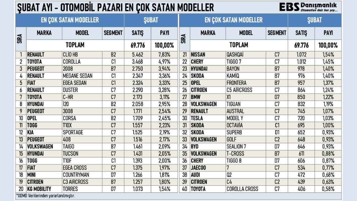Listenin ikinci sırasında, C1 segmentinin vazgeçilmezi Toyota Corolla yer alıyor. Şubat ayında 3.468 adet satış rakamına ulaşan Corolla, %4,97 pazar payı elde etti. Üçüncü sırada ise B-SUV segmentinin güçlü temsilcisi Peugeot 2008 bulunuyor. Ocak ayında 795 adet satan model, Şubat ayında büyük bir sıçrama yaparak 2.750 adet satışa ulaştı ve pazar payını %3,94‘e yükseltti.